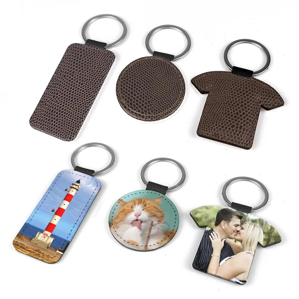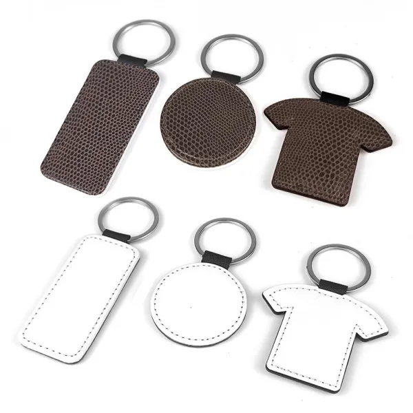 Customizable brown leatherette keychains using sublimation technique.