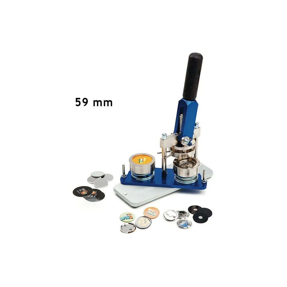 The Button badge making machine with fixed mold B-500/59 is a compact tool for creating fridge magnets and round badges which has a fixed size mold to mount different products of a single measure of Ø59 mm. It is a European-made, high-quality, robust and easy to operate machine, for the production of both small and large quantities of magnets or badges. Depending on the skill of the operator, about 400 magnets or badges can be mounted per hour.