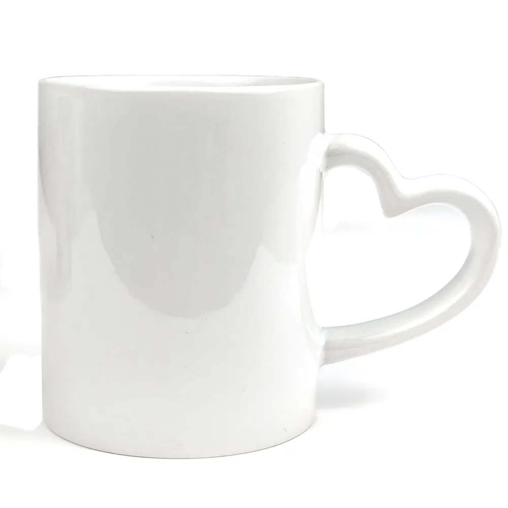 Customizable ceramic mugs using the sublimation technique. The mug handler is heart-shaped.