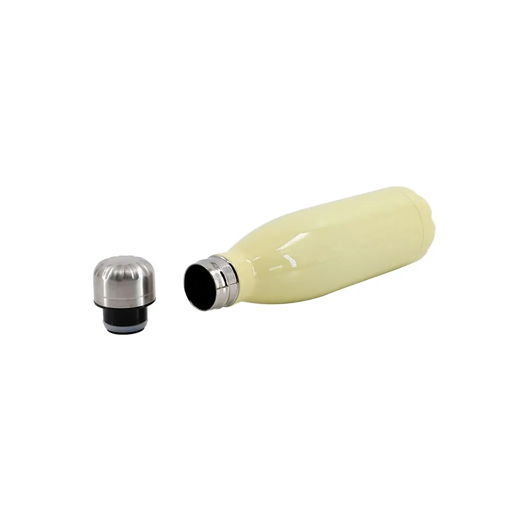 - Stainless steel bottle, perfect for travelling, due to its stockiness and lightness.