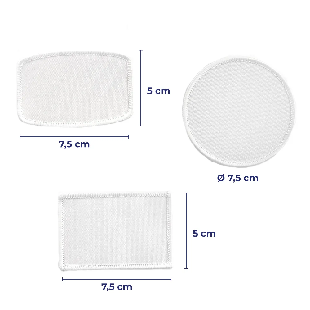The Fabric patch (5 units) is the perfect choice for customization: the 100% polyester fabric is compatible with sublimation and DTF, and the wash-resistant iron-on backing ensures secure application. Ideal for personalizing or repairing clothing, shoes, bags, caps, and sports gear with long-lasting, vibrant designs.