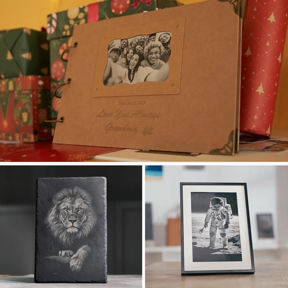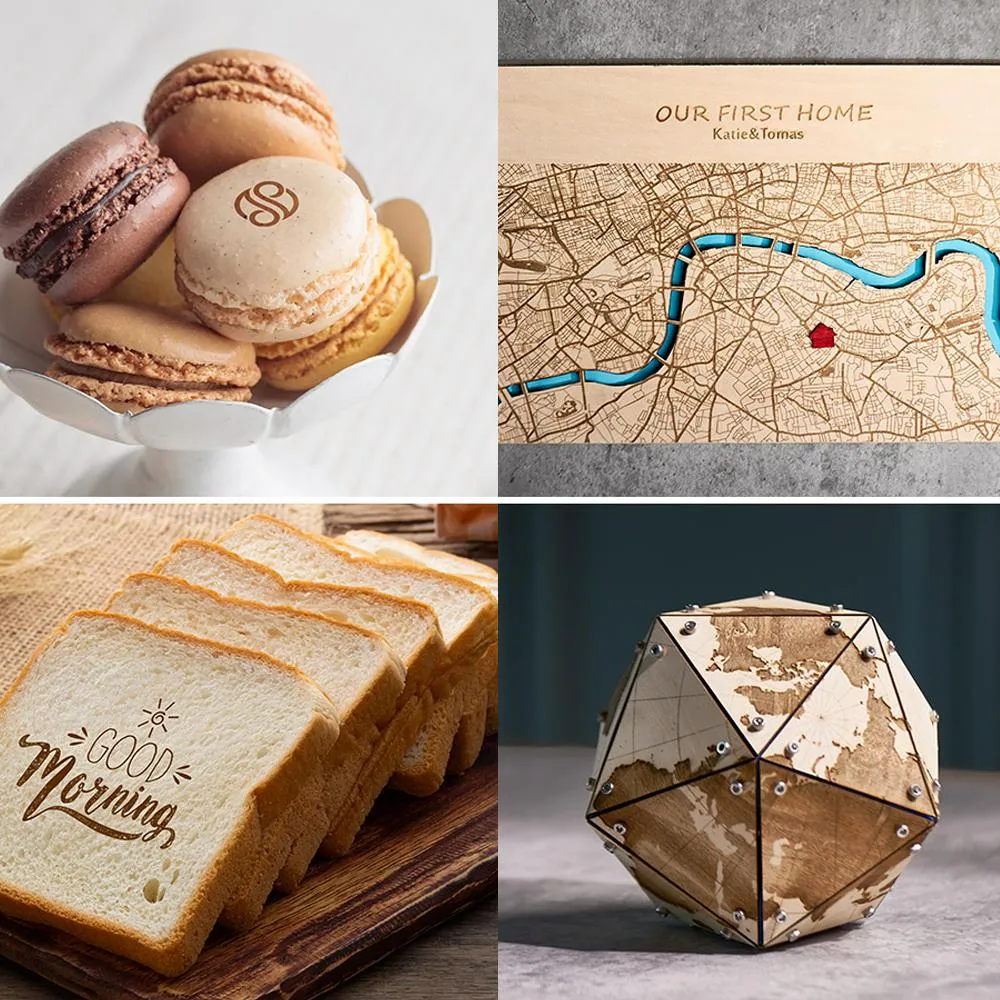 - Artfully engraves: wood, cardboard, acrylic, glass, leather, ceramics, paper, stone, silicone, food, metals, and many more.