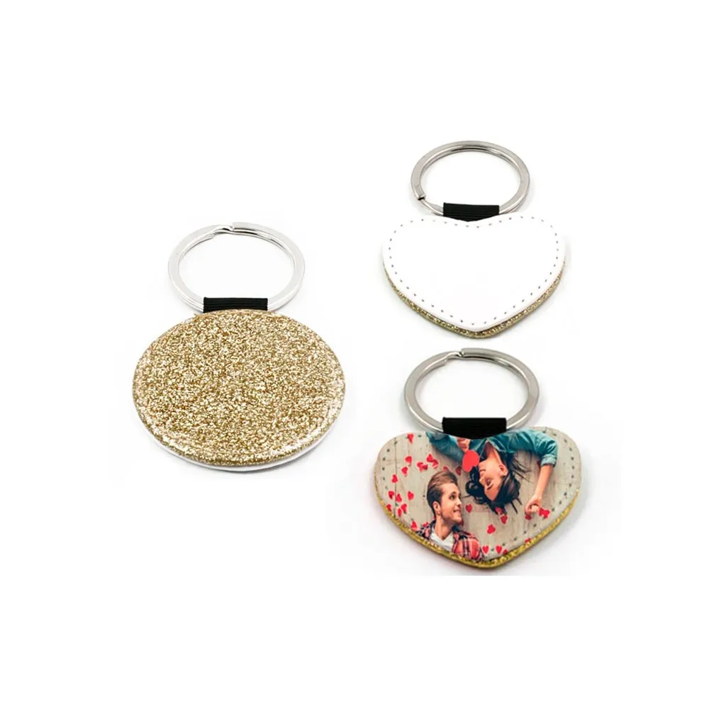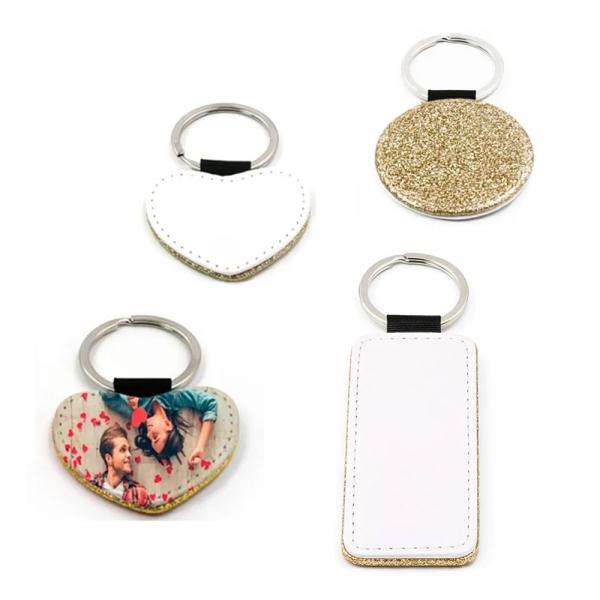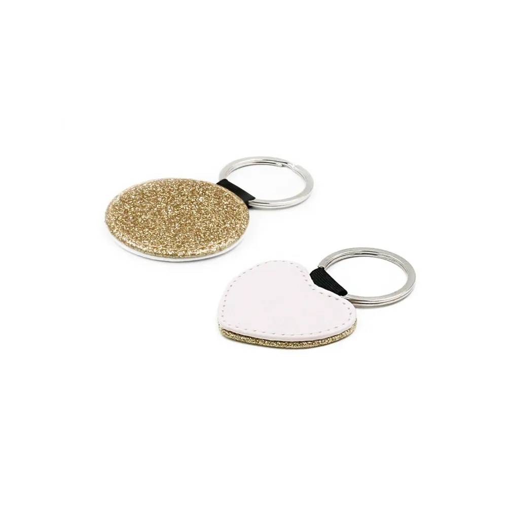 Customizable gold simile leather keychains with glitter using sublimation technique.