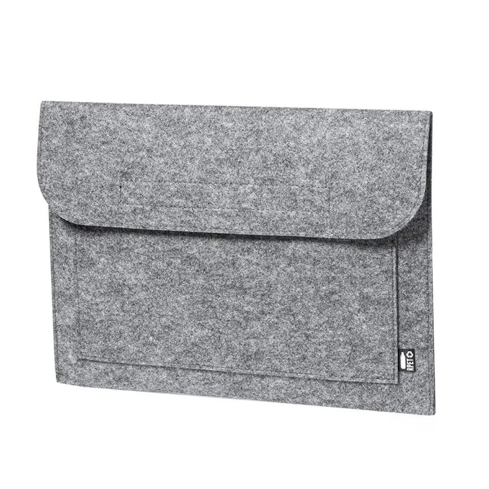 €2.82 Price includes VATRecycled felt laptop bag and document holder prepared to personalize using the sublimation technique. Made with heather gray recycled plastic felt (RPET), with sewn sides and flap with velcro closure. It has a front pocket, ideal for storing your mobile or tablet.