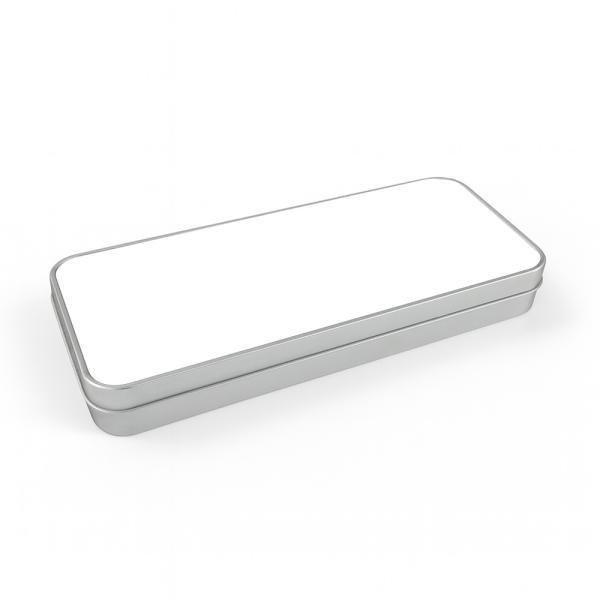 Silver metal pencil box customizable by 2D sublimation technique.