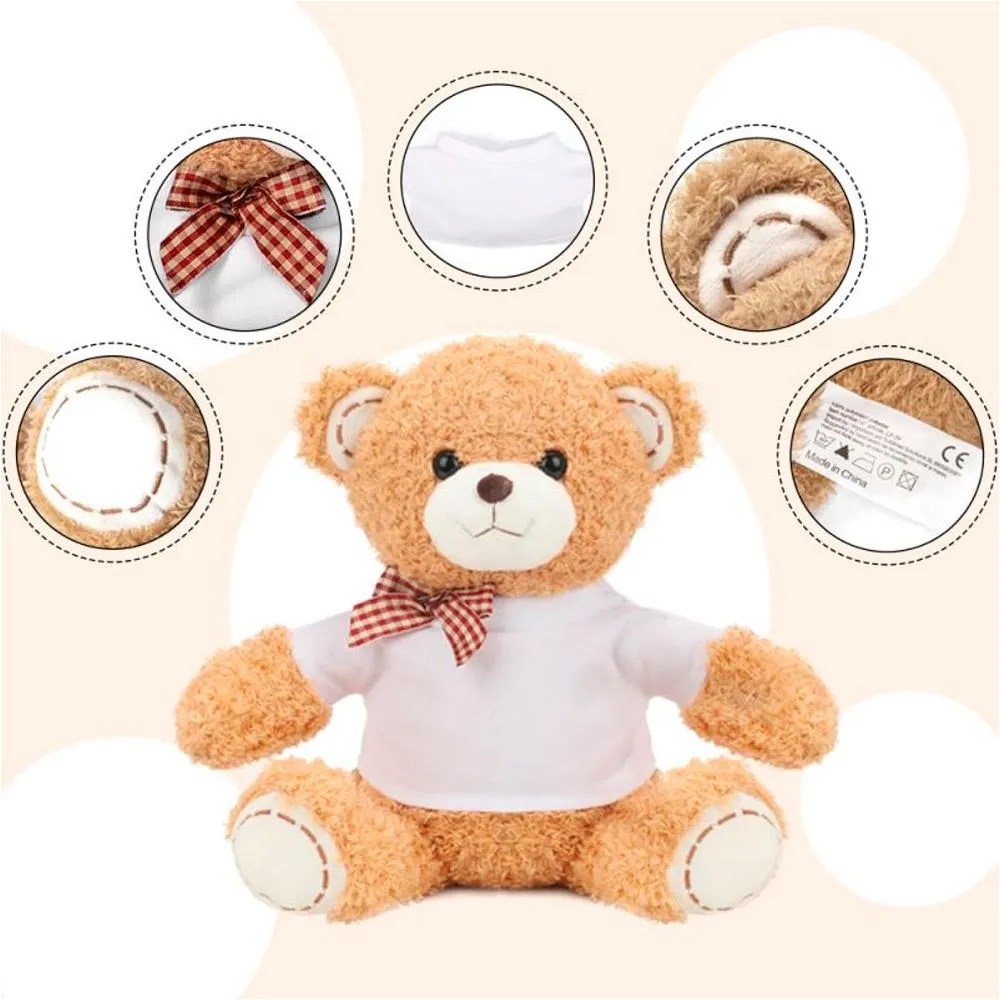 €7.50 Price includes VATTeddy bear 18 cm is a toy with a T-shirt that can be personalized by sublimation. It is a bear with a soft texture and its shirt is made of white polyester, pleasant to the touch. Printing from sublimation ensures that the ink remains on the fabric, providing great durability. To sublimate, the shirt is removed over the doll's head. The teddy bear is not customizable.