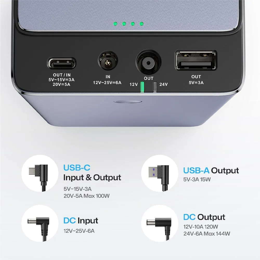 - Puerto DC Ajustable: Mantén presionado el botón de encendido durante 2 segundos para cambiar entre la salida de 12V/24V.