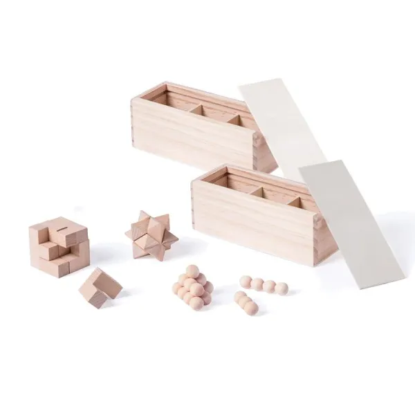Juegos Rompecabezas 3D de madera personalizable mediante la técnica de la sublimación. Set de 3 juegos de habilidad de mandera natural. Los 3 juegos vienen en una caja de madera con 3 compartimentos y tapa deslizante.
