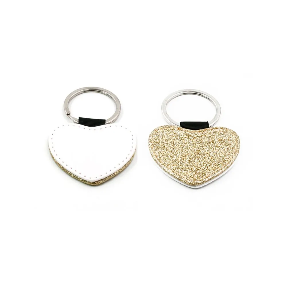 Llaveros de símil piel dorado con purpurina personalizables usando la técnica de la sublimación.