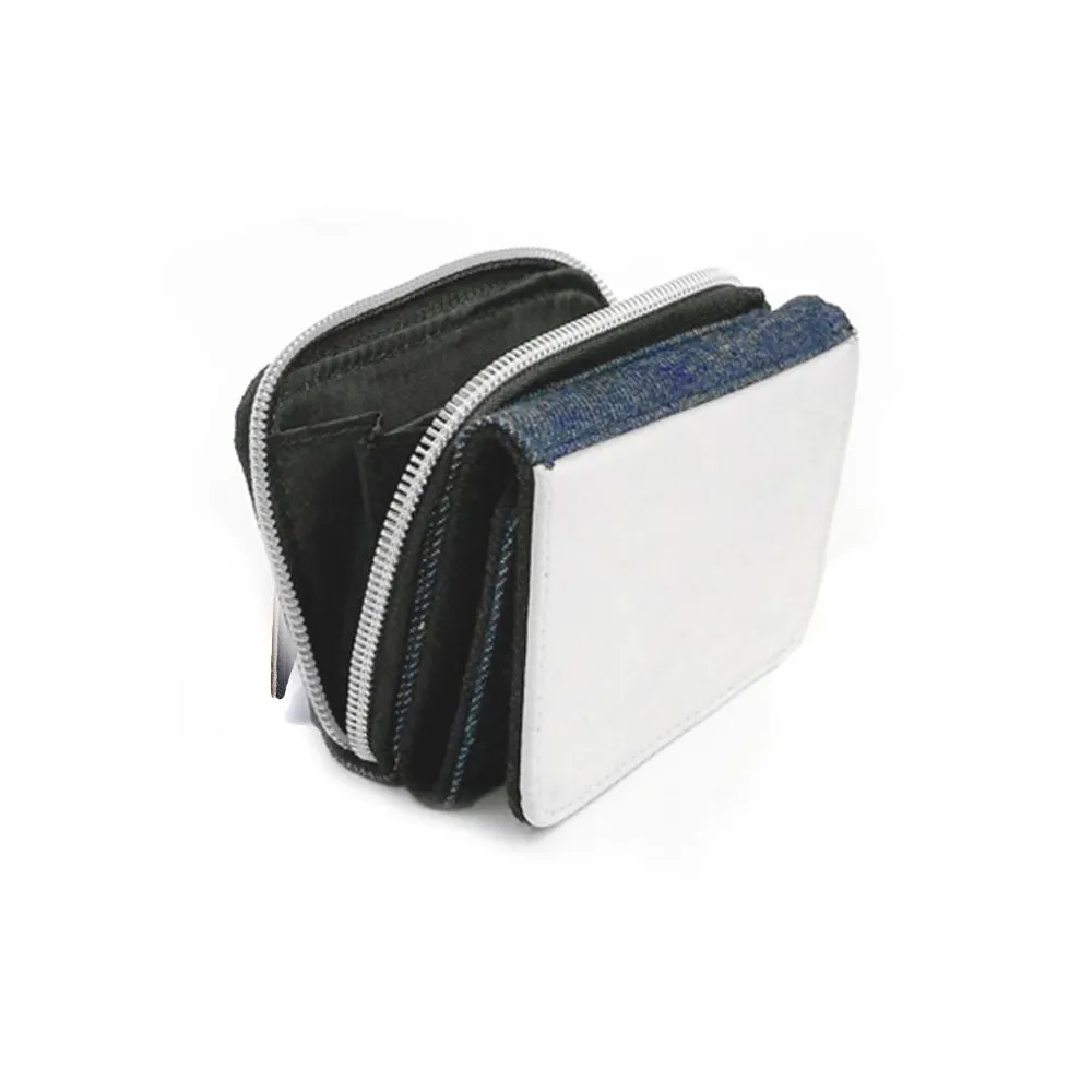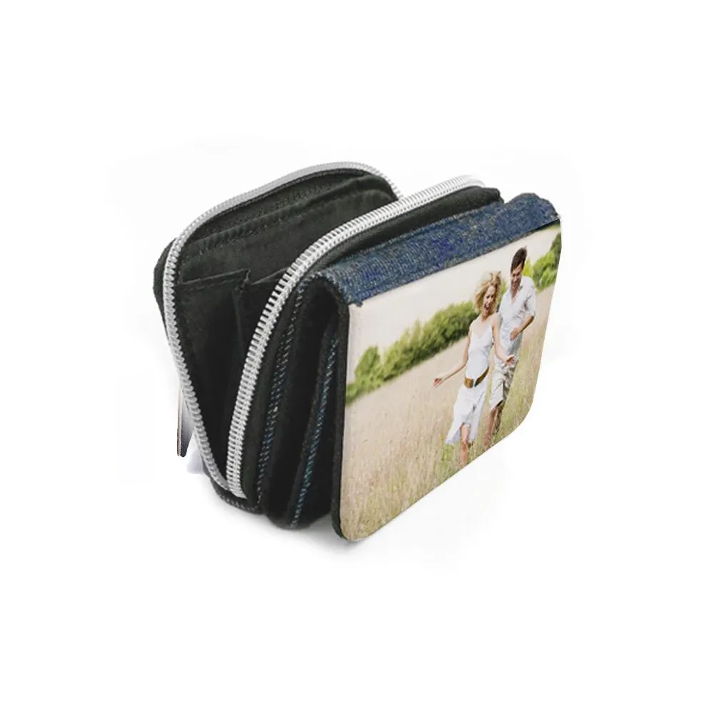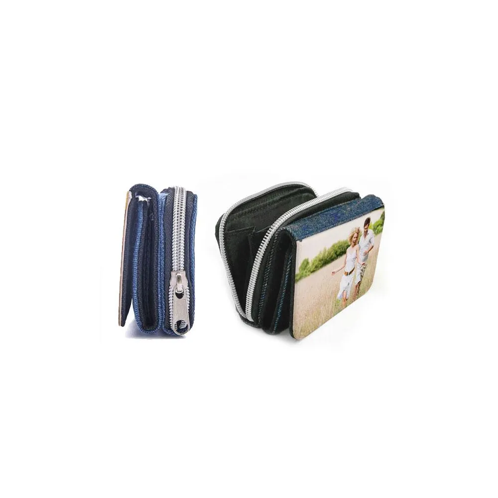 Monedero pequeño vaquero personalizado mediante la técnica de la sublimación, hechos de tejido vaquero son perfectos para tu día a día. El monedero es de color azul marino con una cara preparada para sublimar.
