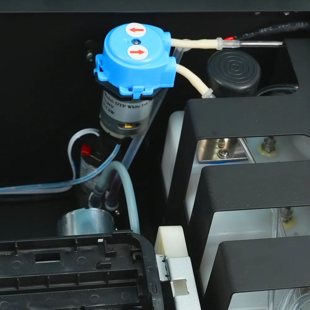 - Circulating System: el sistema de recirculación de tinta, el agitador de tinta blanca y el filtrado adicional en los dampers, evitan la formación de sedimentos y obstrucciones.
