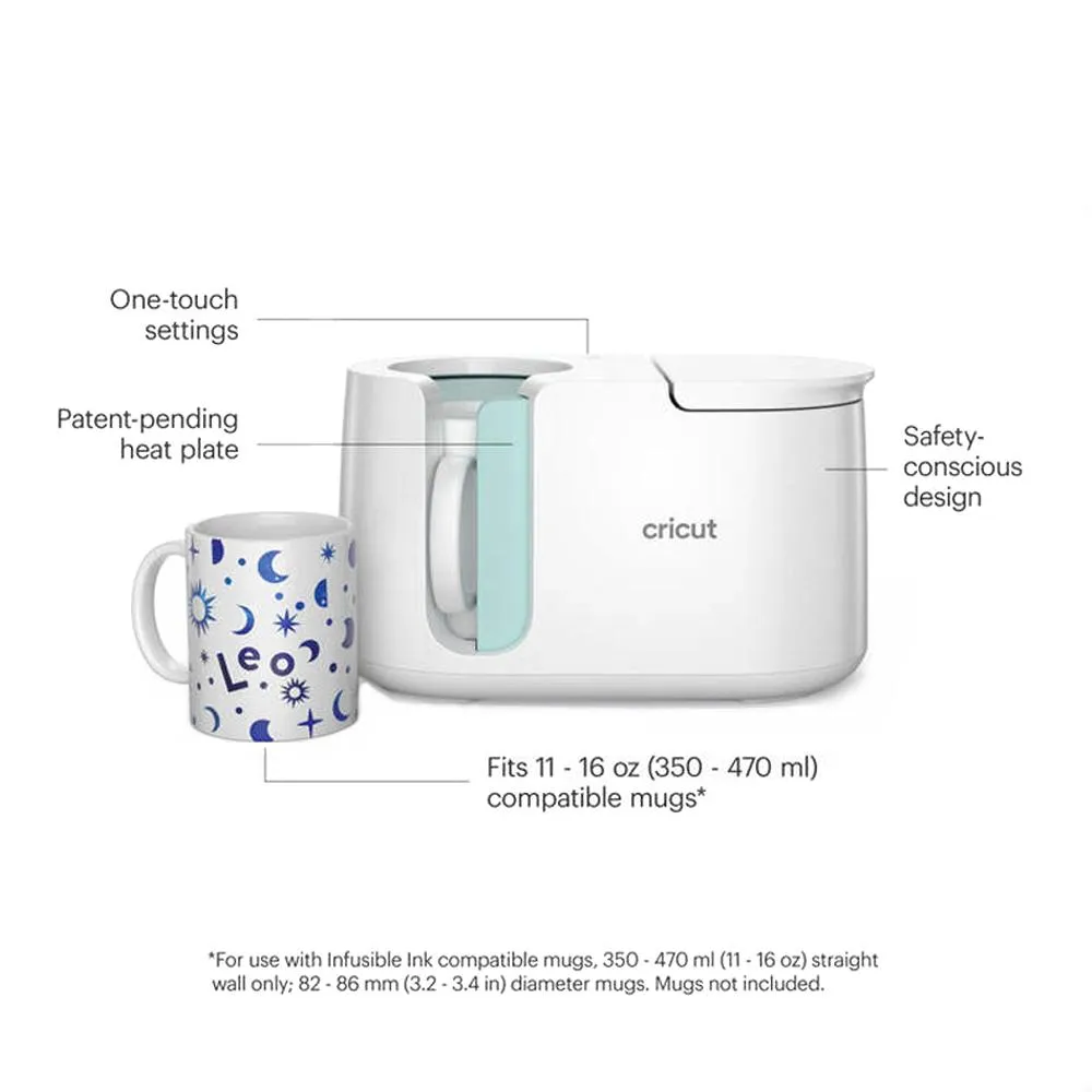 Cricut Mug Press es una plancha térmica para crear tazas personalizadas de calidad profesional con la técnica de la sublimación. Crea tu diseño, fíjalo en la taza y deja que la plancha haga el resto. Es muy fácil de usar, sin ajustes manuales de temperatura y presión, se pueden personalizar tazas preparadas para sublimación en minutos. Es el complemento perfecto de cualquiera de los plotters de corte de Cricut.