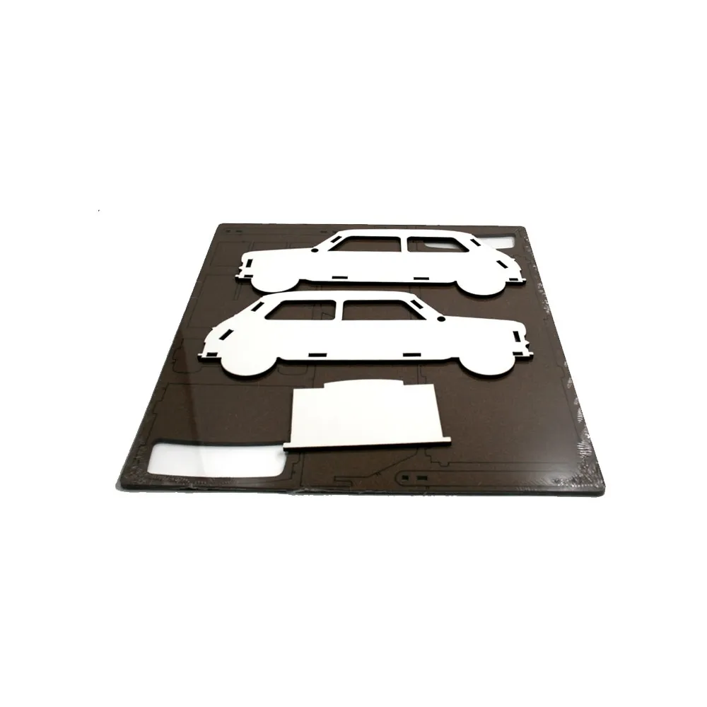 - 13 piezas: 10 color madera (estructura coche) y 3 blancas para sublimar (laterales de la carrocería y frontal).
