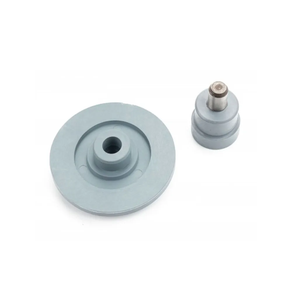 Para montar cada tipo de llavero se requiere un accesorio específico. Cada útil consta de dos piezas, una superior y una inferior. La pieza superior se ajusta por medio de una rosca a la pieza móvil de la máquina, mientras que la pieza inferior se apoya en la base y queda centrada con un pasador de guía.