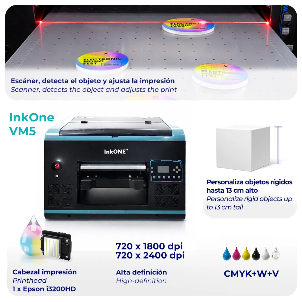 Imprimante UV InkOne VM5 (30x40cm) est une imprimante UV à plat de nouvelle génération, conçue pour imprimer directement sur des objets jusqu’à 13 cm de hauteur. Elle intègre un scanner de détection automatique des objets, un vernis UV et un design compact, idéal pour une production professionnelle.