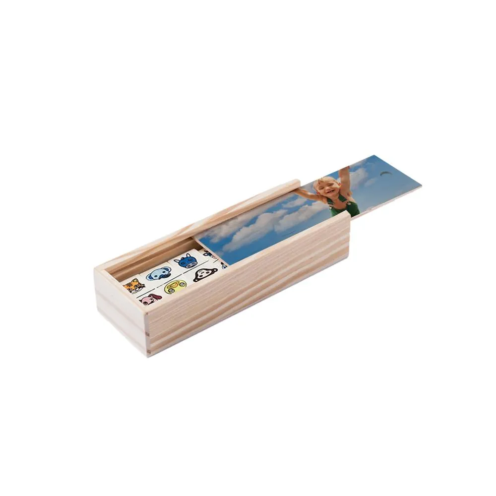Jeux Domino personnalisables par technique de sublimation. Ce jeu éducatif est idéal pour les cadeaux. 28 pièces de bois de dominos avec un étui à couvercle coulissant.