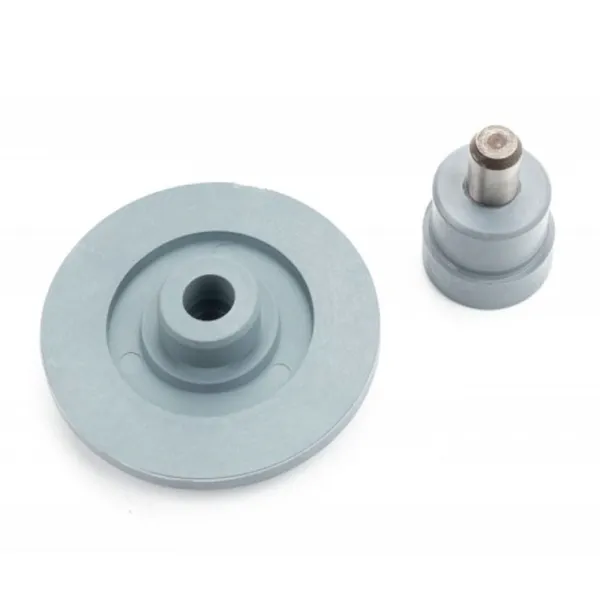 Pour monter chaque type de porte-clés nécessite un accessoire spécifique. Chaque outil se compose de deux pièces, une supérieure et une inférieure. La partie supérieure est ajustée au moyen d'une vis à la partie mobile de la machine, tandis que la partie inférieure prend appui sur la base et est centrée avec une tige de guidage.