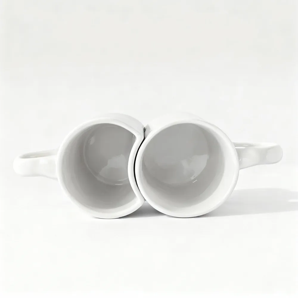 Tasses en céramique couple avec porgnée coeur personnalisables utilisant la technique de la sublimation. Les anses des tasses sont en forme de cœur.