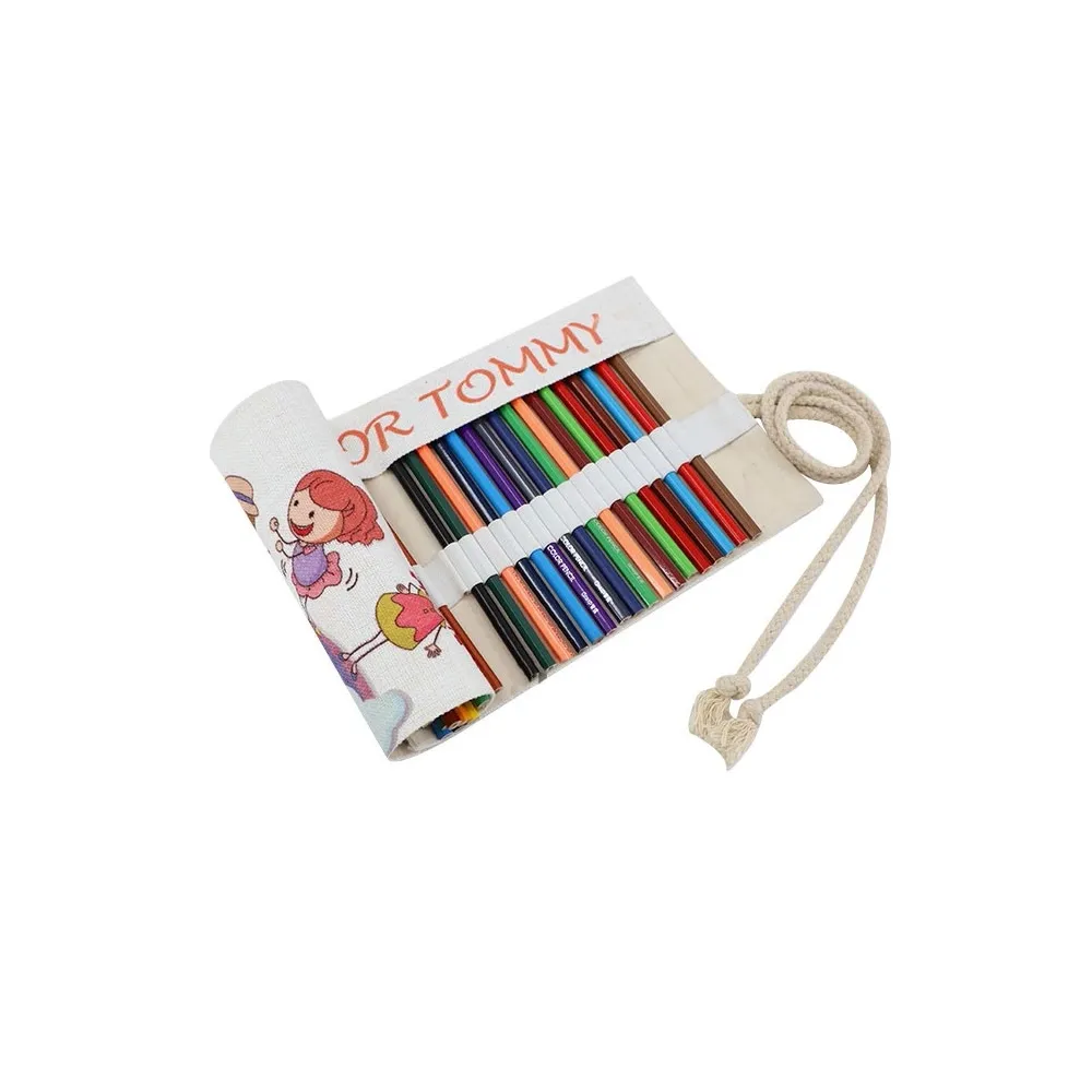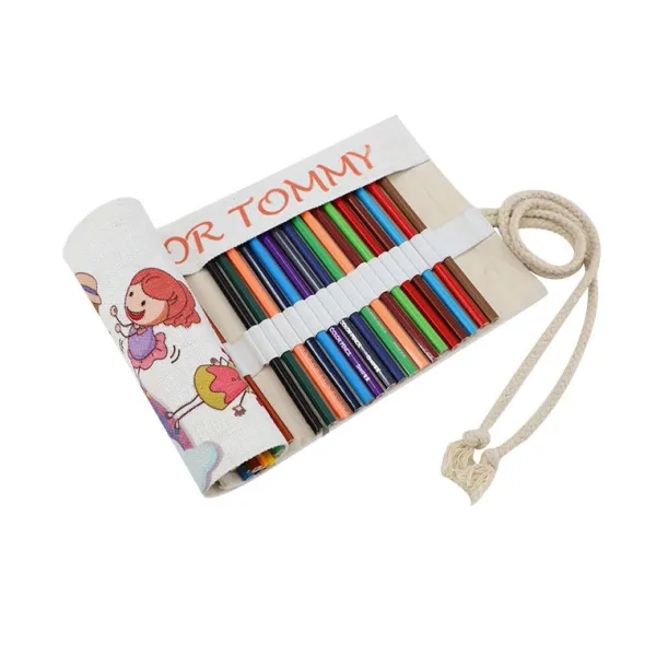 Es un estuche enrollable de lapices, el tejido es similar al lino,lo que hace que sea liviano, ademas sirve tanto para peques como para adultos. Fácil de personalizar.