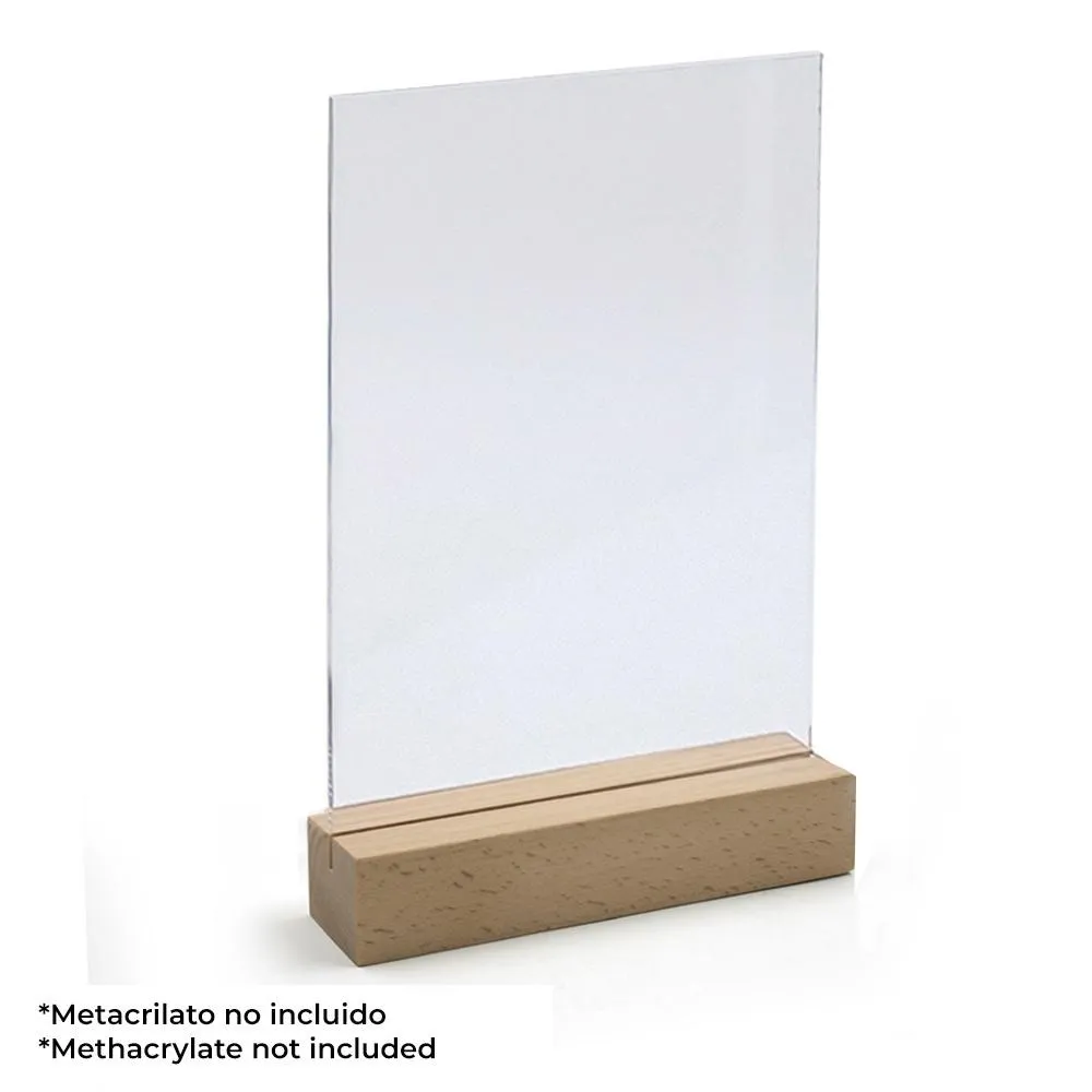 Base legno con LED multicolore per pannelli e acrilico con fessura da 3,5 mm, studiata per sostenere in verticale pannelli in acrilico o lastre in acrilico. Include una luce LED multicolore nella fessura per illuminare il pannello trasparente. La base è rettangolare con bordi arrotondati. Può essere personalizzato.