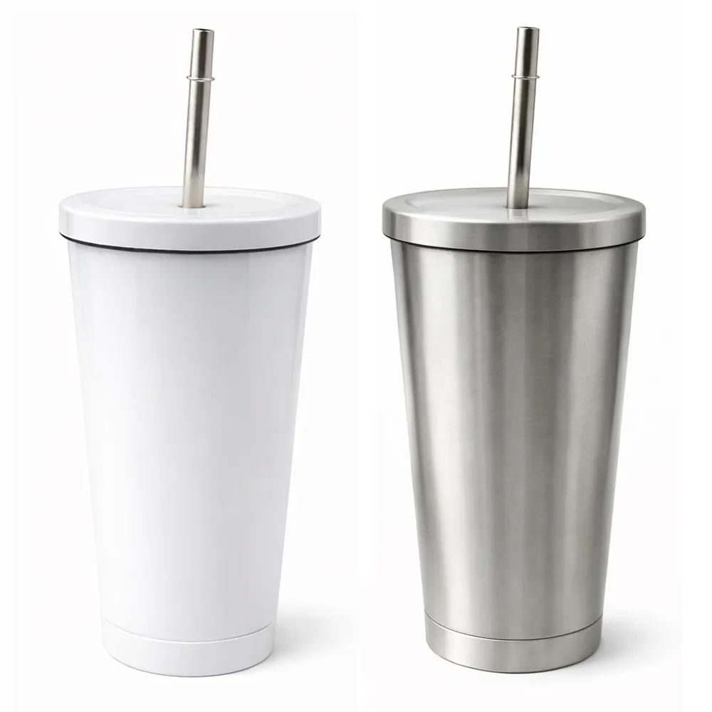 Bicchiere termico in acciaio inox con cannuccia 450 ml personalizzabile tramite la tecnica della sublimazione.