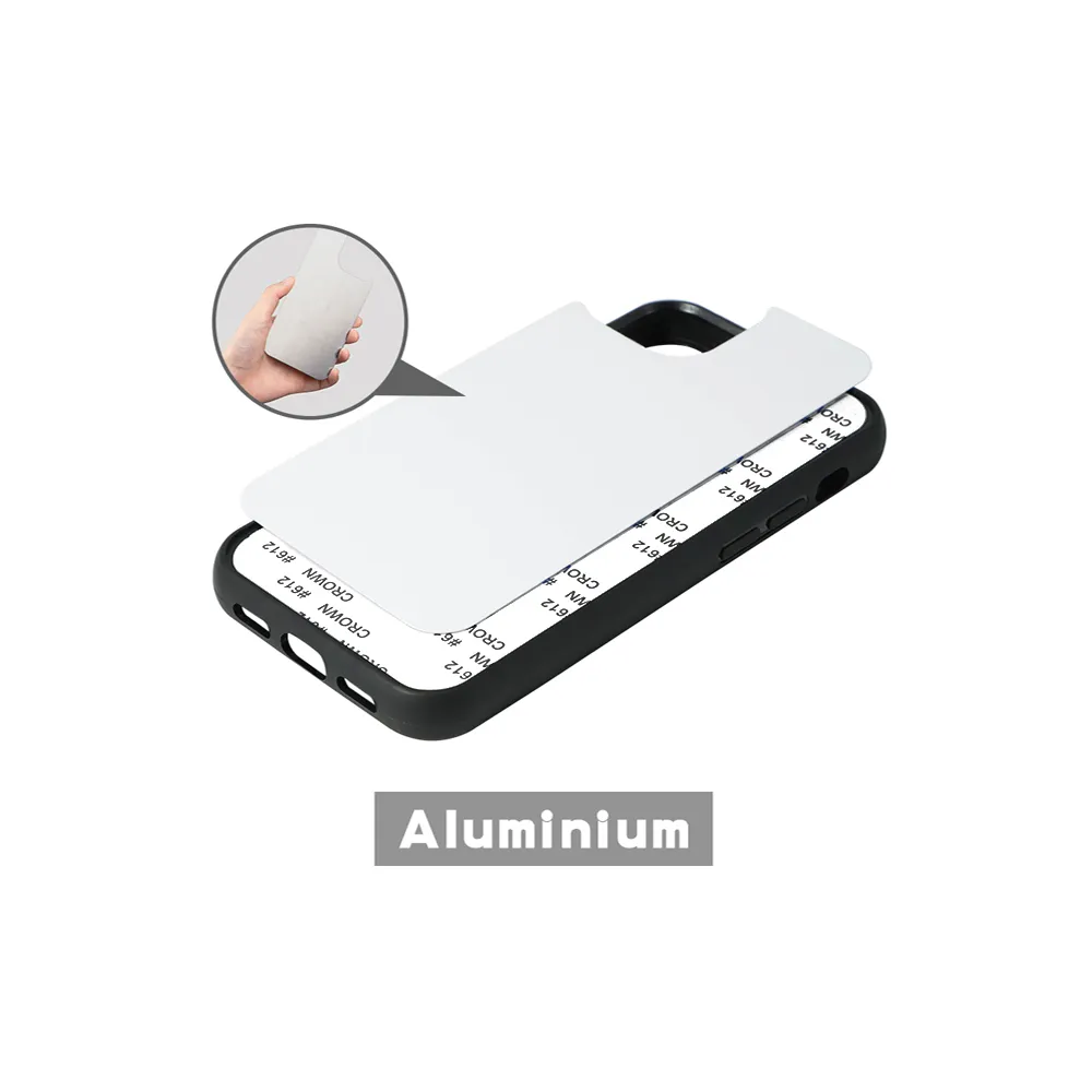 Le cover para sublimación in fogli di alluminio per iPhone 13 Mini sono predisposte per essere sottoposte a sublimazione nella parte superiore, lasciando i lati nel colore della cover nera.