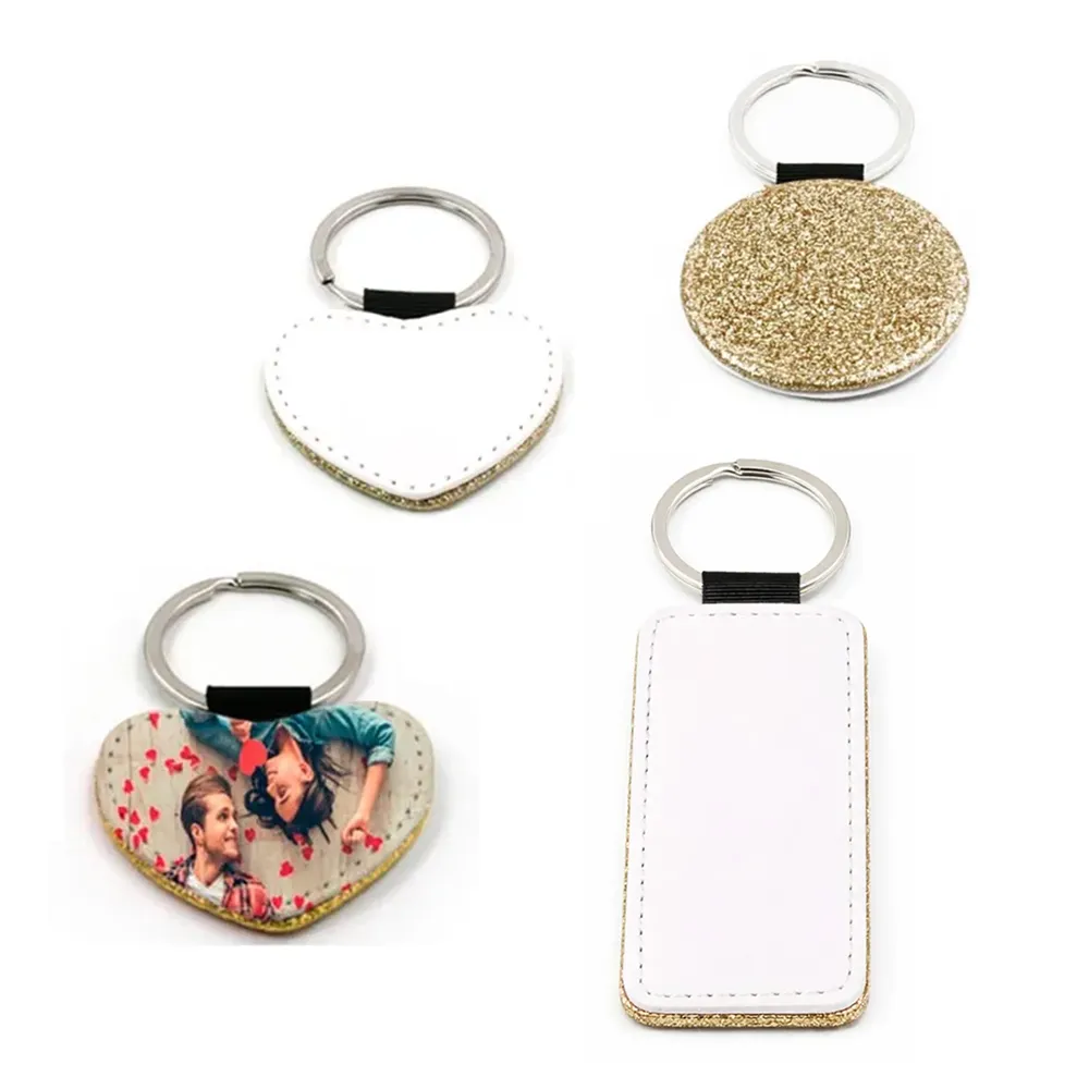 Portachiavi in similpelle dorata con glitter (varie forme) personalizzabili tramite la tecnica della sublimazione.