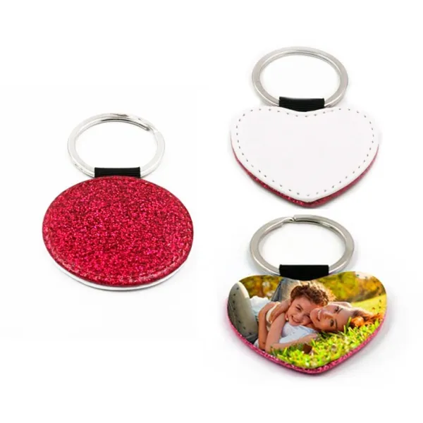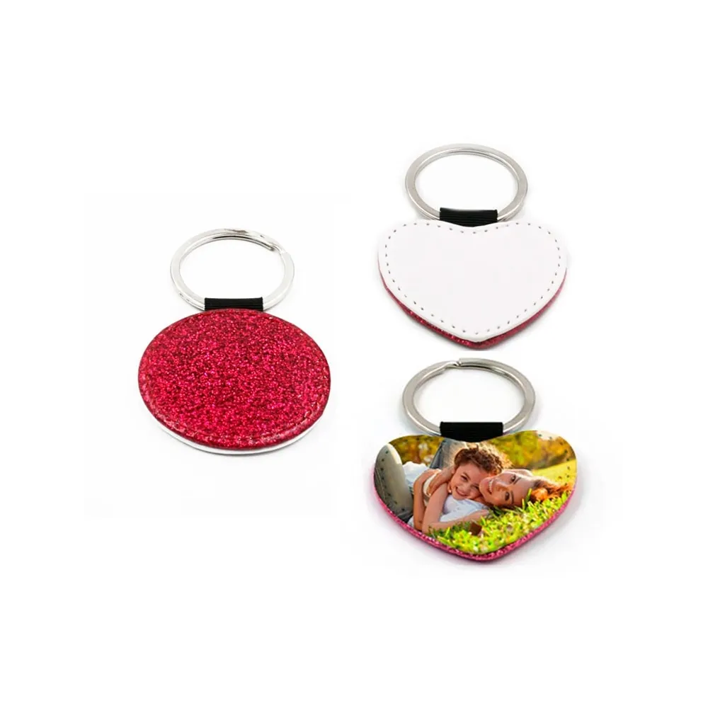 Portachiavi similpelle rosa con glitter, personalizzabili tramite la tecnica della sublimazione. Materiale di alta qualità e resistente. Include anello metallico per chiavi.