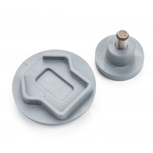 Per montare ogni tipo di portachiavi è necessario un accessorio specifico. Ogni utensile è composto da due pezzi, uno superiore e uno inferiore. La parte superiore è fissata tramite un filo alla parte mobile della macchina, mentre la parte inferiore poggia sulla base ed è centrata con un perno guida.