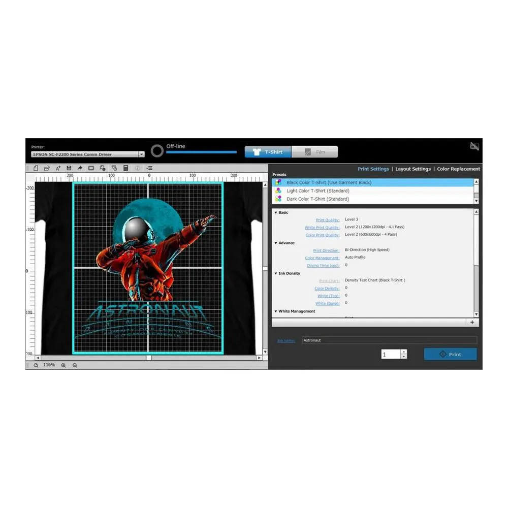 Carica facilmente i tuoi progetti, seleziona le impostazioni predefinite e stampa i lavori con il nostro software Garment Creator 2 appena aggiornato. Grazie all'interfaccia semplice e intuitiva e alla facile navigazione, è possibile creare preset per DTG e DTF. Ciò include la messa a punto della gestione del colore e della qualità, nonché delle dimensioni e della duplicazione del design, per garantire risultati eccezionali ogni volta.