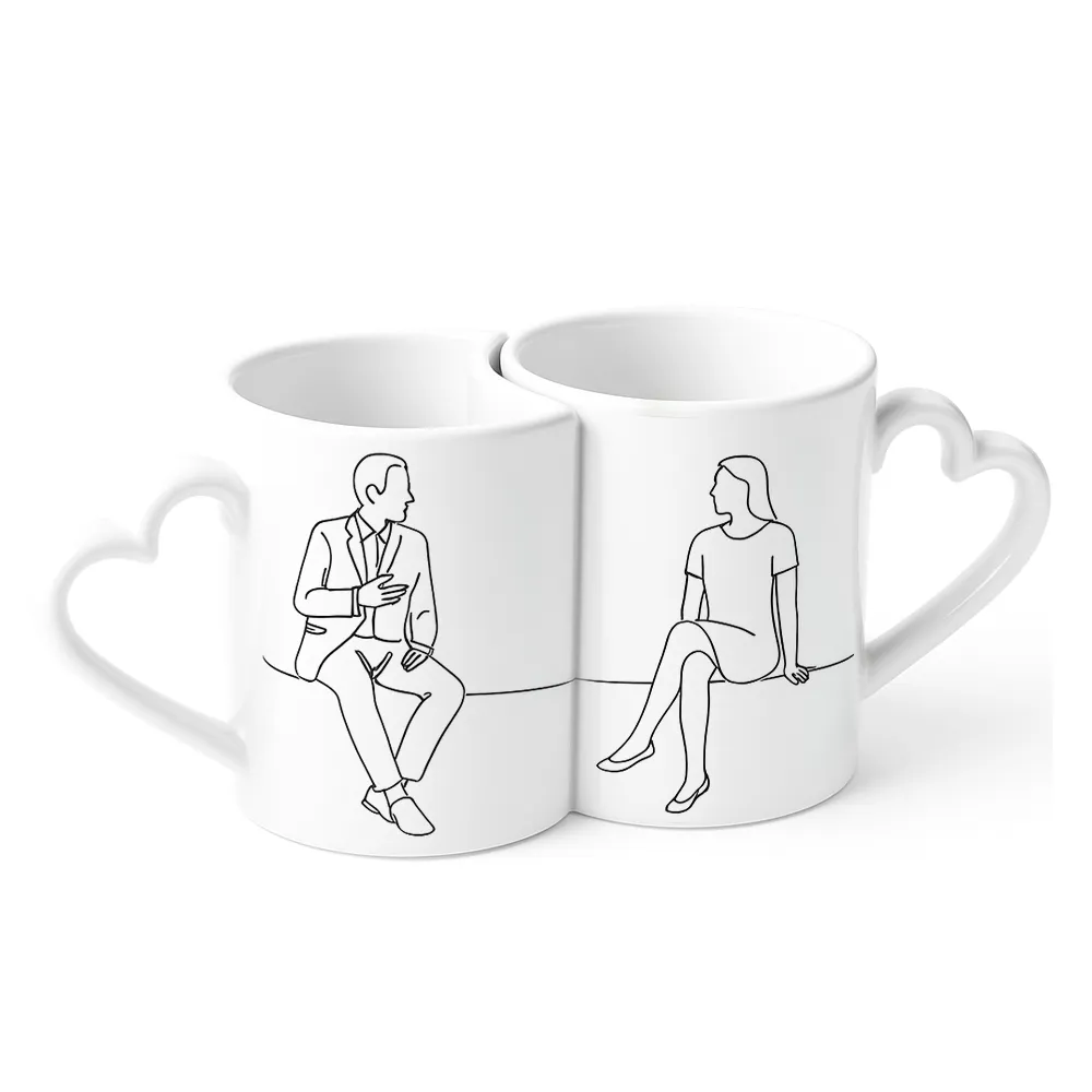Set di due Tazze ceramica coppia cuore personalizzabili con la tecnica della sublimazione. I manici delle tazze sono a forma di cuore.