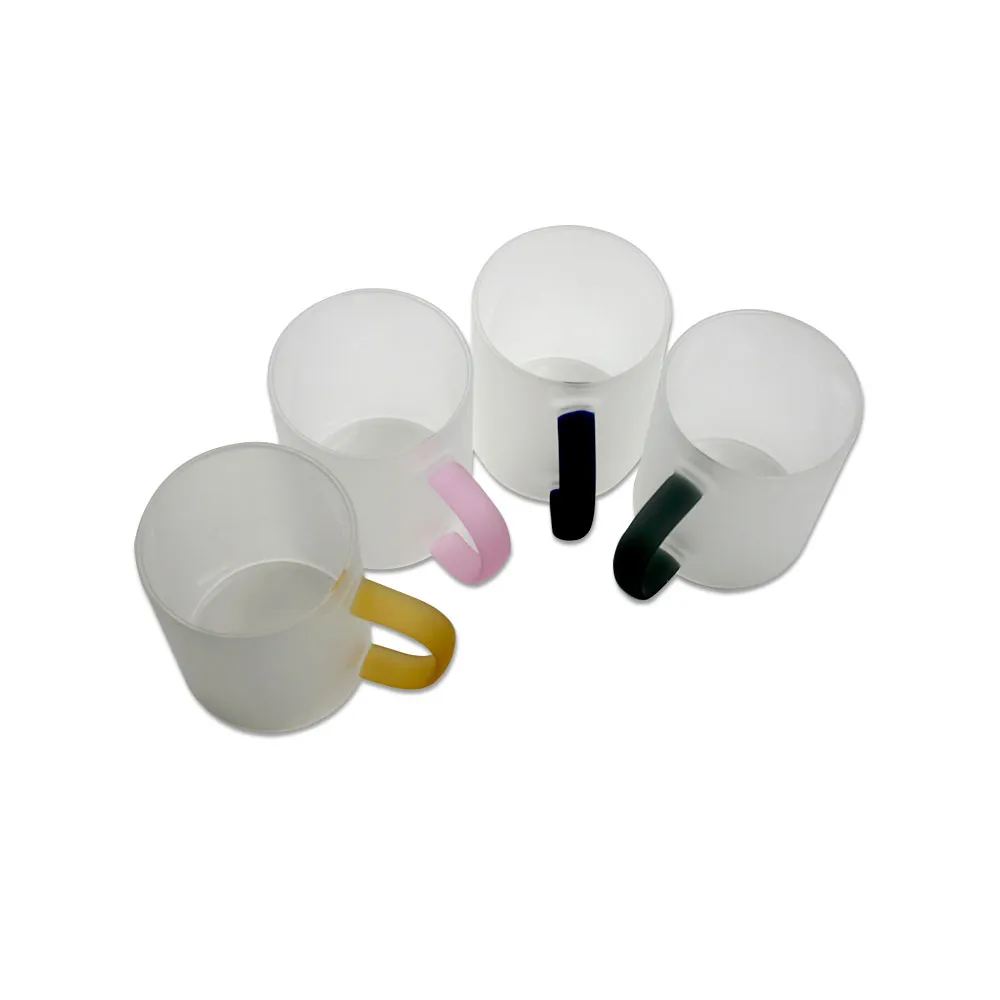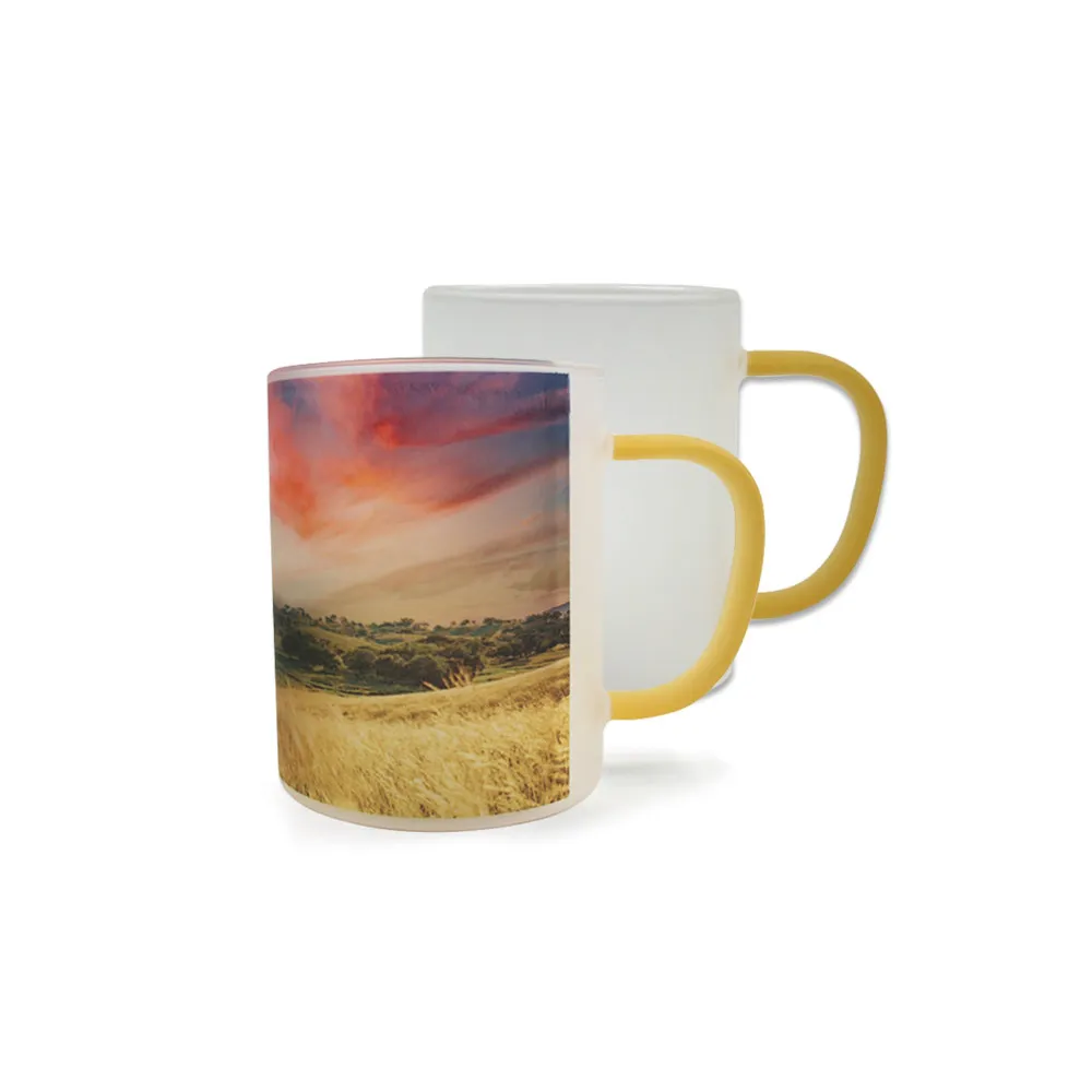 Tazze in vetro smerigliato colorato da personalizzare con la tecnica della sublimazione. Il colore smerigliato fornisce una base chiara per esaltare i colori dei design stampati sulla superficie. Il manico è disponibile in diversi colori per abbinarlo all'immagine o alla frase personalizzata scelta. Include scatola singola. Possono essere utilizzate per bevande calde o fredde.
