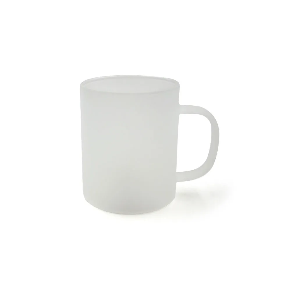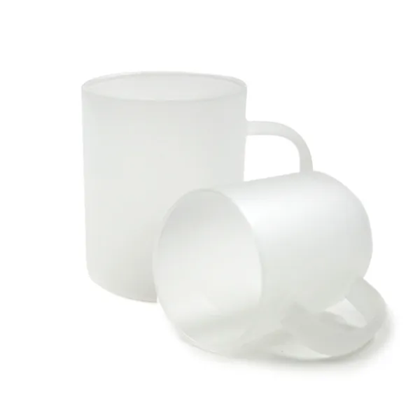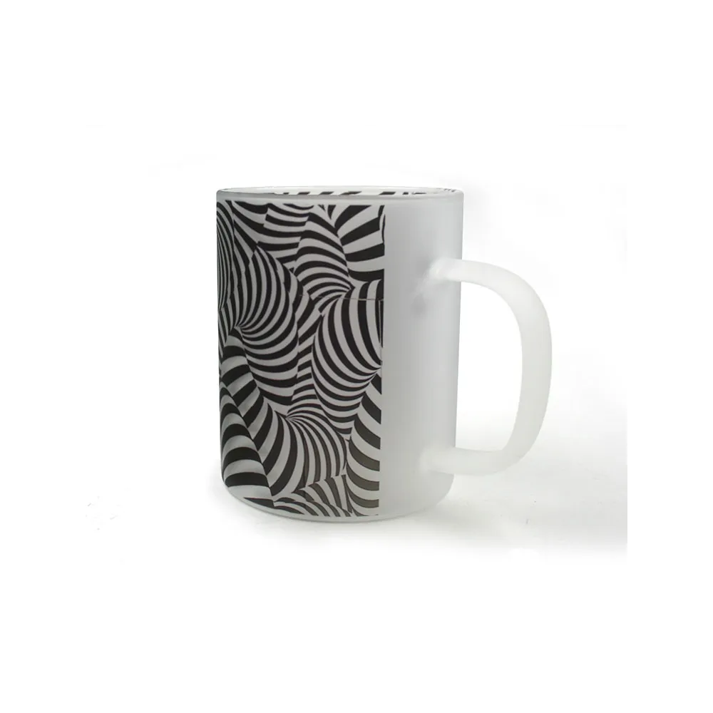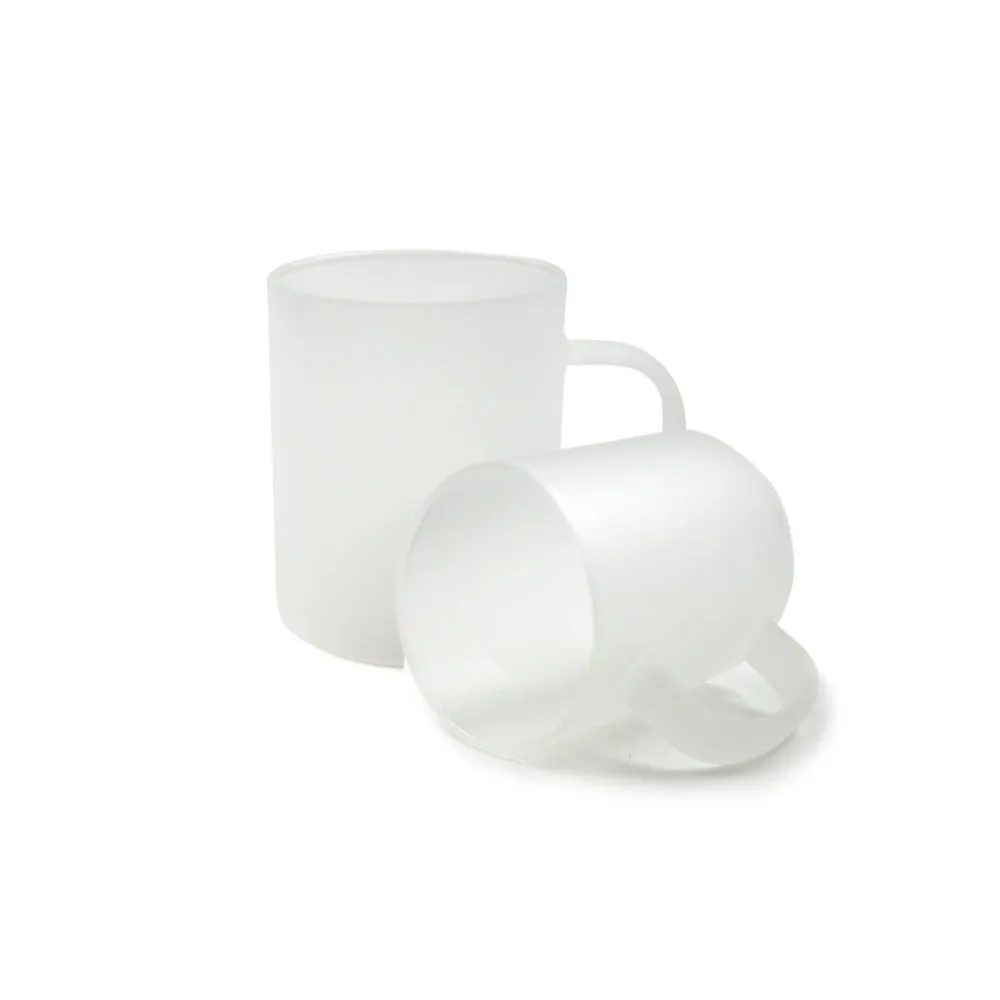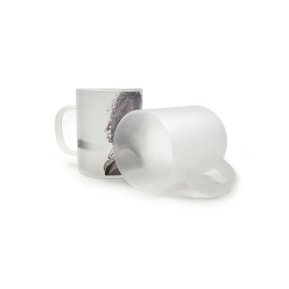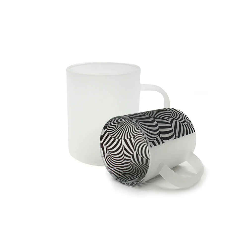 Tazze in vetro smerigliato da personalizzare con la tecnica della sublimazione. Il colore smerigliato fornisce una base chiara per esaltare i colori dei design stampati sulla superficie. Possono essere utilizzate per bevande calde o fredde.
