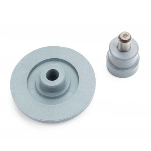 Per montare ogni tipo di portachiavi è necessario un accessorio specifico. Ogni utensile è composto da due pezzi, uno superiore e uno inferiore. La parte superiore è fissata tramite un filo alla parte mobile della macchina, mentre la parte inferiore poggia sulla base ed è centrata con un perno guida.