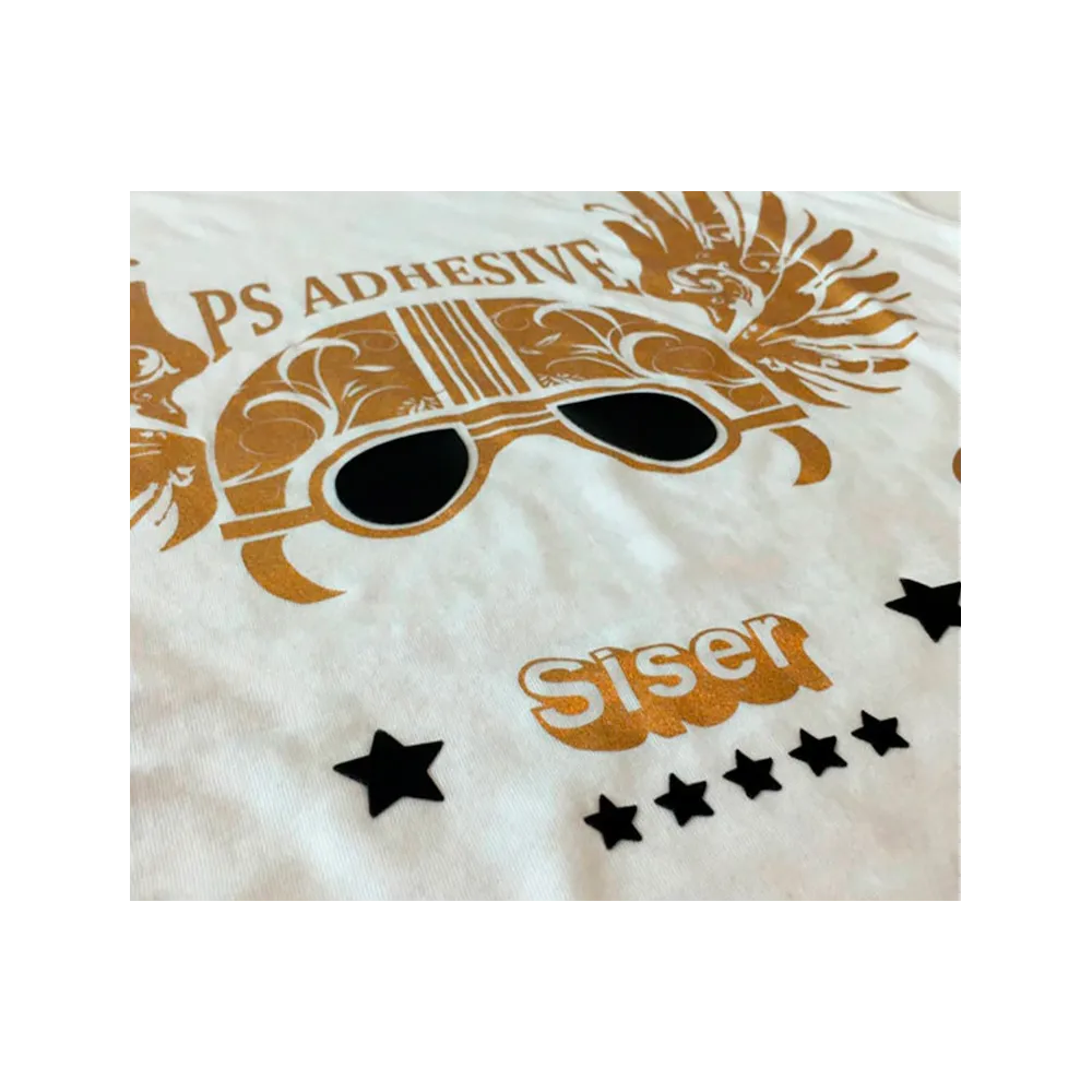 I vinili tessile adesivi Siser PS sono pellicole termoadesive per il taglio a plotter con poliestere adesivo e strato protettivo, studiate per l'applicazione della stampa serigrafica carta di alluminio. Si tratta di un vinile trasparente che si utilizza come doppio adesivo, una parte aderisce al capo una volta stirato, mentre il poliestere viene rimosso. Effettuiamo la stiratura finale con il colore scelto, che aderisce solo al disegno stirato con l'Adesivo PS.